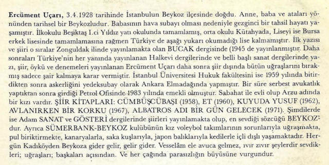 Siz Ercüment Uçarı'nın beklide her şiirinde, onun o giz dolu korkak, ürkek, cesur, kahraman, parasız, güç dolu, orgazmımı başaran ya da başaramayan yaşamının sürecinin midyaları içindeki gizli incilerden sevaplarını, günahlarını, kirlerini akpaklığını tatmanın bedeniyle suçlu ya da suçsuz gözlerindeki kuşku dolu pisliklerinin yakaları kararmış gömlekleriyle bir densizliğini bulacaksınız.